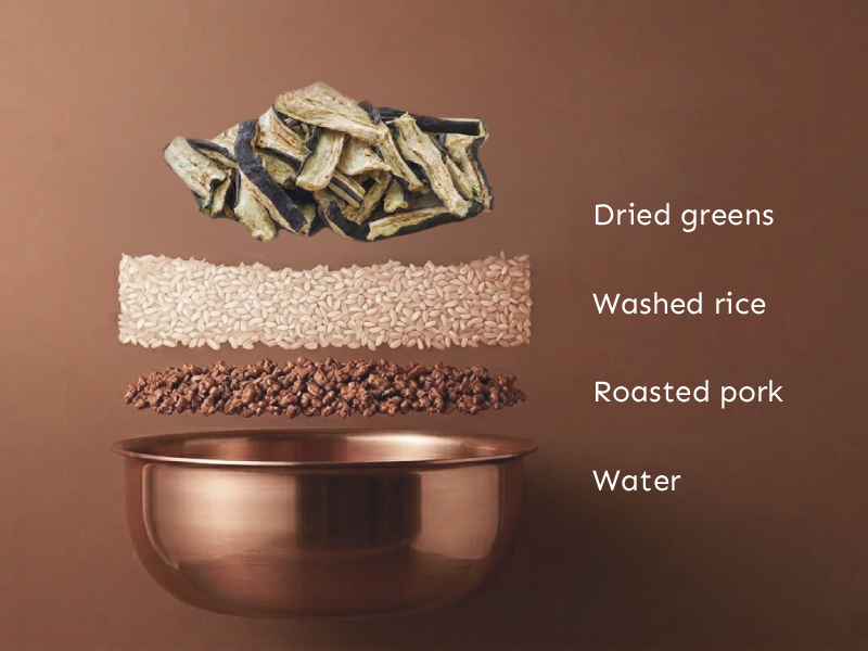 My secret recipe is simple: I start by layering pieces of roasted pork (seasoned with garlic and salt) at the bottom of the pot. Then, I add the rinsed rice or mixed grains, and finally, a generous heap of washed dried vegetables on top.